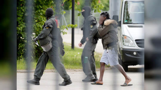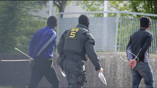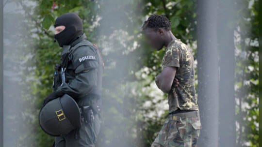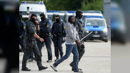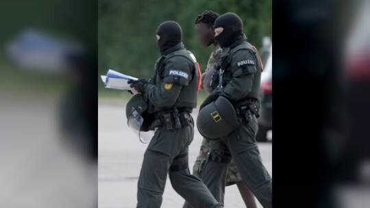 In der Landeserstaufnahmeeinrichtung für Flüchtlinge (LEA) wird ein gefesselter Mann von maskierten Polizisten abgeführt.