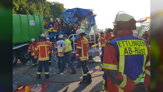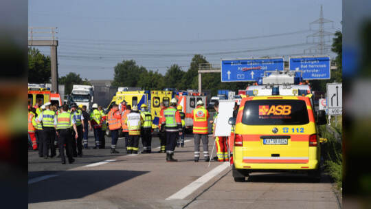 Bei einem Busunglück auf der A5 sind am Mittwochmorgen mehr als 30 Menschen verletzt worden, einer von ihnen tödlich.