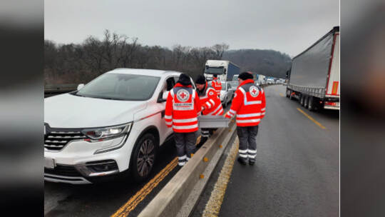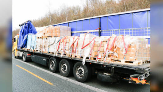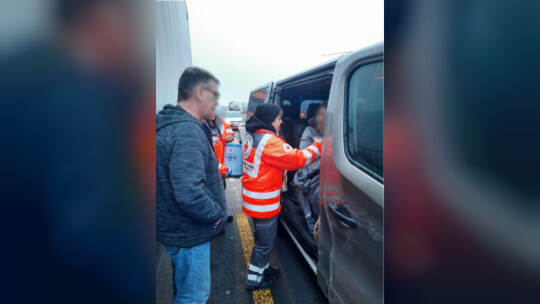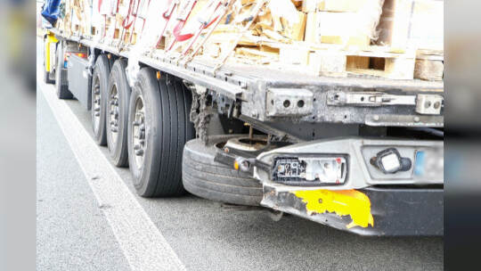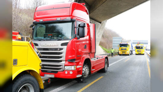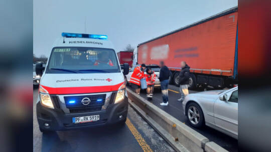 Ein Lastwagenfahrer bremst wegen einer Reifenpanne im A8-Baustellenbereich bei Pforzheim – ein anderer fährt auf. Zwischen Pforzheim-Nord und Ost war die Autobahn am Samstagvormittag zeitweise beidseitig gesperrt. Ehrenamtliche des DRK versorgten die im Stau stehenden Auto- und Lastwagenfahrer.