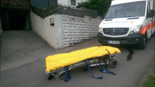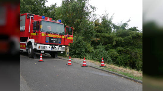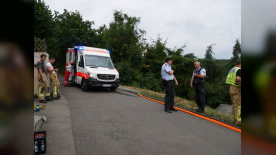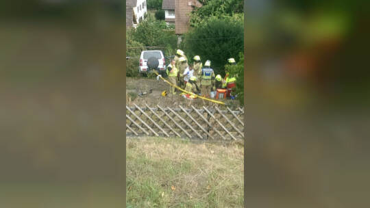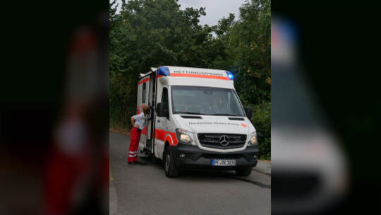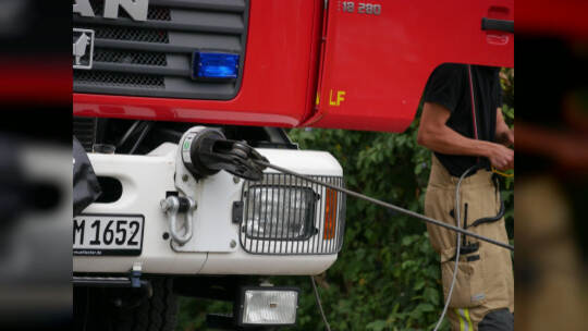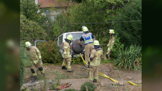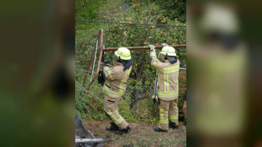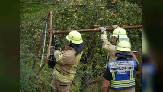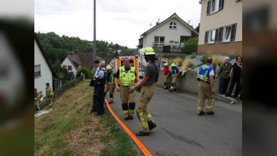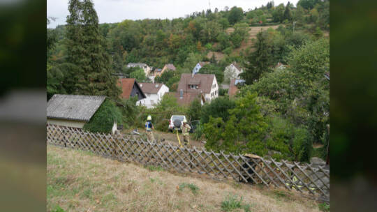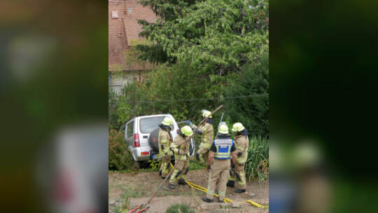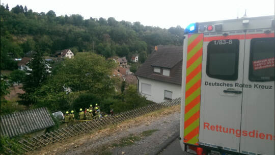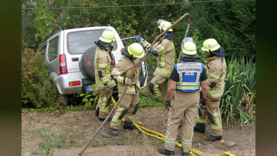 Ein 83-jähriger Mann ist am Montagmorgen mit seinem Auto einen 15 Meter langen Hang in Enzberg hinuntergefahren. Er musste von der Feuerwehr befreit werden. Fotos: TV-BW, Kneis/DRK