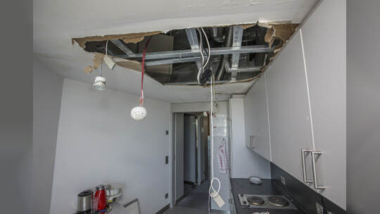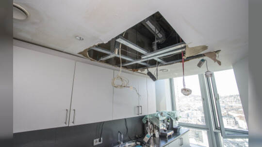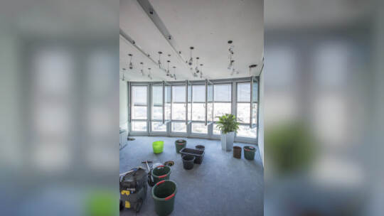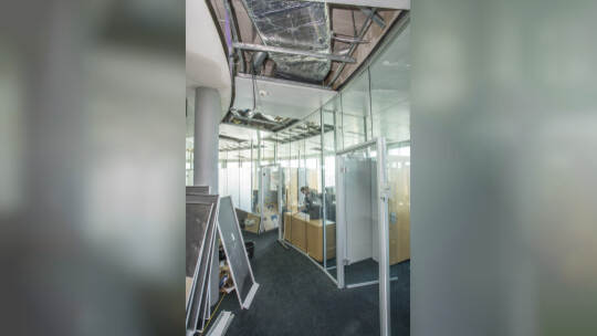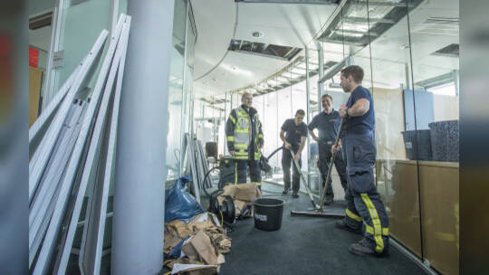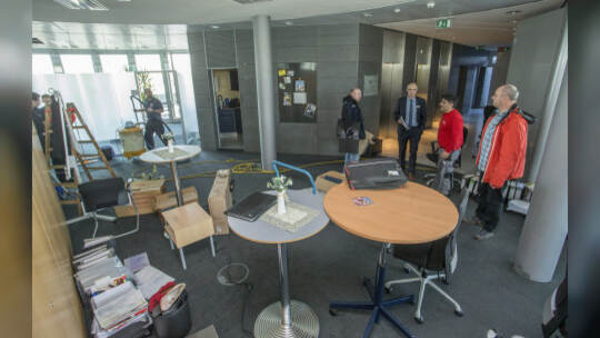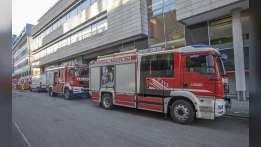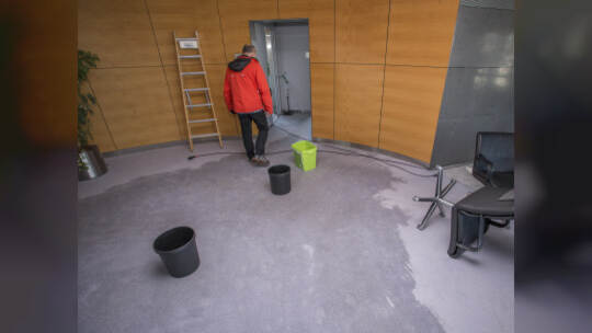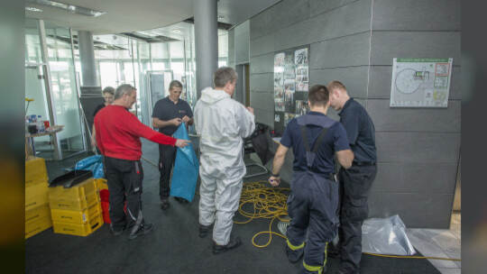 Kleine Ursache, große Wirkung – ein Wasserschaden im Turm der Hauptgeschäftsstelle der Sparkasse Pforzheim Calw hat am Mittwochmorgen nicht nur für einen längeren Feuerwehreinsatz gesorgt. Der über Nacht ungebremste Wasserfluss vom 13. Stock hinunter bis zum 4. Stock wird die Arbeit der Sparkassen-Mitarbeiter noch für mehrere Tage beeinflussen, gleichwohl der Sparkassen-Kunde nichts davon bemerken dürfte. Fotos: Meyer