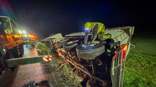 BildergalerieFolgenschwerer Unfall bei Königsbach-Stein: Aufwendige Lastwagenbergung bis in den Abend
