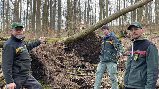Der Maulbronner Forst BW-Revierförster Hartmut Flunkert (von links), Praktikant Florian Bregler und Sebastian Kraus, stellvertretender Forstbezirksleiter Unterland, zeigen Eschen, die kürzlich in Straßennähe vom Wind entwurzelt wurden. Foto: Hepfer