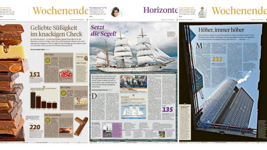 Bei der Horizonte-Seite zur „Gorch Fock“ lobt Küpper, dass neben dem großen Foto und dem Bericht in einer Zeitschiene die Geschichte des Schiffes dargestellt wird. In einer kleinen Infografik werden die Namen der Masten benannt und Angaben zur Länge und Höhe des Schiffes gemacht. Auch das Thema Schokolade werde im Wochenend-Magazin in Textblöcken präsentiert. Zahlen und eine Infografik begleiteten die textliche Information leserfreundlich.