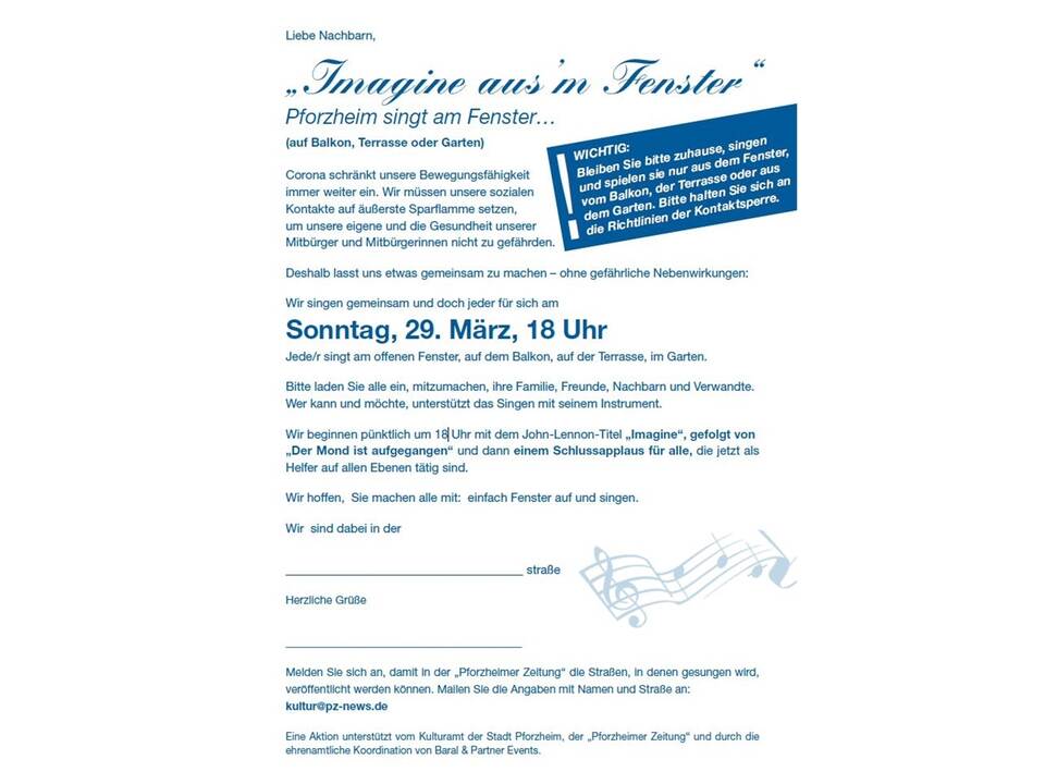 Und damit immer mehr Menschen am Fenster, vom Balkon, der Terrasse oder aus dem Garten singen und ein Instrument spielen, bietet die PZ unter www.pz-news.de einen Nachbarschafts-Flyer mit den genauen Daten an, der angeklickt und heruntergeladen werden kann. Wer aus der Region gerne mitmachen möchte: Einfach Nachbarn, Familie und Freunde einladen und es die PZ wissen lassen. Weitere Adressen werden in den nächsten Tagen veröffentlicht.