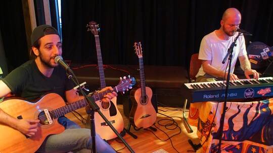 Zusammen mit Philipp Marx sitzt der junge Mann mit dem schwarzen Bart und der Basecap am Freitagabend auf der kleinen Bühne im Café des Pforzheimer Kupferdächles. Beide sind Musikpädagogen, beide treten regelmäßig auf. Seit rund fünf Jahren machen sie schon zusammen Musik.