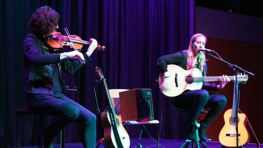 Isa Kimmel spielte ihre fünfsaitige Violine poppig und crossover, sie sorgte für musikalische Sahnehäubchen und rhythmischen Drive oder staffierte Jule Malisches „Cool Song“ ansatzlos mit filigran perlenden Pizzicati aus. Malischkes helle, klare Stimme, ihr gekonntes Gitarrenspiel und Kimmels jubilierende „Teufelsgeige“ schmeichelte sich auf leisen Samtpfoten in die Gehörgänge der Konzertbesucher. Erleichtert wurde dies auch durch die von den Technikern des Musikvereins – Fabian Neubauer und Benjamin Jost – exzellent ausgesteuerte Beschallung.