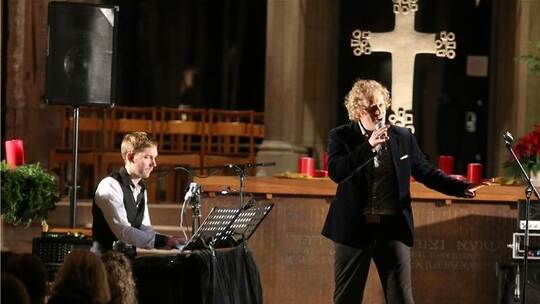 Wenn auch die unbändige Stimmkraft, Präsenz und Ausdrucksfähigkeit des Vollblut-Musical-Sängers bei den Liedern fasziniert und überzeugt: Es sind ein paar zu viele Schmusesongs, die das Weihnachtskonzert zähfließend in die Länge ziehen. Mit Inbrunst singt Murray seinen Dracula-Song „Ich leb nur, weil es dich gibt“, der in der hallenden Kirche und durch die elektronische Verstärkung etwas in den Ohren schmerzt. Zärtlicher wirkt da die Ballade „Bring ihn heim“ aus „Les Misérables“ oder „Was habe ich getan“ aus „Vom Geist der Weihnacht“. „Wir alle können Scrooge sein, wenn wir vergessen, was wichtig ist im Leben“, kommentiert der Sänger. Einen eigenen, aktuellen Song zum Programm hat der Pianist angeregt – „Was Weihnacht wirklich ist“. Es ist weniger die Melodie, die berührt, sondern eher der tiefgründige Text, der sich auf Krieg und Gewalt bezieht und den Menschen in den Mittelpunkt stellt.
