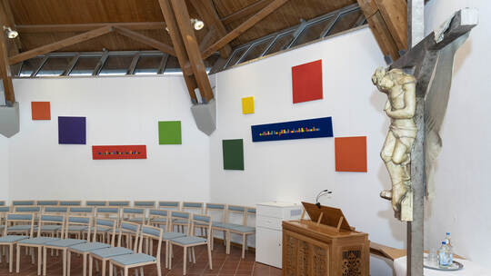 Aber auch wer den runden Raum von außen betritt, wird geführt, „immer auf der Leuchtspur zu dir“ – so der Titel der Ausstellung von Elisabeth Nüchtern. Er ist angeregt von einem Gedicht von Nelly Sachs. Vier Zeilen davon hat die Karlsruher Autodidaktin chiffriert und verfremdet, indem sie Wortumrisse in farbigen Rechtecken nachformt. Auch das ist zu bewundern in der Kapelle. Nüchtern wollte an diesem Ort des Innehaltens einen inneren Bezug erzeugen, wie sie sagt, und das Leiden Christi, aber auch das Herabsteigen vom Kreuz abstrakt darstellen. Es entsteht ein Dialog zwischen Kunst- und Kirchenraum.