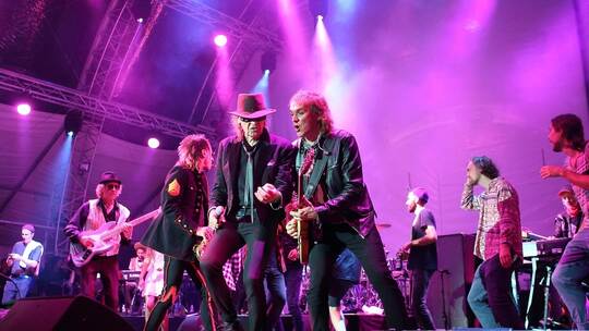 Klingt alles nicht so toll? Doch! Doch! Doch! Denn wenn Udo mit seiner Musik loslegt, gibt es kein Halten mehr. Die Menge gerät in Bewegung, singt lautstark mit – bei „Mein Ding“, „Durch die schweren Zeiten“, „Cello“ und all den alten Hits. Jetzt geht die Party richtig ab, bis nach 24 Uhr. Da gibt es gigantische Bläsersätze, mitreißende Gitarrensoli unter anderem von Carola Kretschmer bei „Stärker als die Zeit“, wunderbare Duette mit Nathalie Dorra („Das Leben“), Ina Bredehorn und Joe Linde, der den immer mal wieder mit Eierlikörchen gurgelnden Lindenberg stimmlich unterstützt.