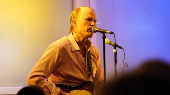Sein Begleiter Pelle Anderson hält sich am Keyboard dezent zurück und schafft mit schönen Effekten die Basis für Kjellvander, der eine tiefe, erdige Stimme voller Kraft und Volumen hat. Er wirkt, als ob ihn nichts aus der Ruhe bringen könnte. Auch wenn er damit, wie er sagt, „mehr wie ein Mathelehrer“ aussieht, zieht er nach ein paar Stücken seine schwarze Jacke über das hellrote Hemd. Die Kälte zwingt ihn dazu.