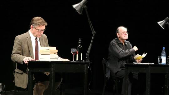 Ja, und dann Philipp Mosetter als Regisseur mit staubtrockenem, fein nuanciertem Humor. Er setzt die spitze Feder an und dringt zum Kern der Textaussagen vor, etwa dass Goethe die Quantenphysik vorweggenommen und sogar verstanden hat („… dass ich erkenne, was die Welt im Innersten zusammenhält“) und entdeckt auch Beispiele für die Anwendung der Heisenberg’schen Unschärferelation. Extensive Interpretationen von Goethes Werk, Leben und Leib samt Lustangst und Verdauungsbeschwerden führt er ad absurdum. Die Walpurgisnacht wird effektvoll mit den Paralipomena ergänzt. Und muntere Exkurse über erste Liebe und Papierflieger bringen dann doch noch einen Hauch von Comedy ins literarische Kabarett.