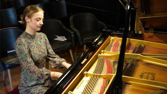Stürme des Beifalls und der Begeisterung löst auch der Auftritt von Marina Müllerperth aus. Auf dem Klavier des „Domicile“, einem wohlklingenden Konzertflügel, nimmt sie das Publikum mit auf eine Reise durch die Epochen der klassischen Musik. Es geht vorbei an Bach, an Chopin und an Ravel. Müllerperth brilliert mit perfektem Tastenanschlag und einer äußerst feinfühligen Spielweise, die selbst kleinste Nuancen abbildet. Wie selbstverständlich fließen die Melodien vor sich hin, wie ein zarter Klangteppich, der sich sanft über den gesamten Saal des „Domicile“ legt. Müllerperth hat schon einmal dort gespielt: als Kind, zusammen mit anderen Jungstudenten der Karlsruher Professorin Sontraud Speidel. Inzwischen hat Müllerperth ihren Masterabschluss in der Tasche. Sowohl als Solopianistin als auch in Orchestern ist sie international gefragt. Unter dem Namen „Belisama Classics“ hat sie ihr eigenes Festival gegründet, das dieses Jahr im Juli stattfinden soll und Frauen in der Musik in den Mittelpunkt rückt.