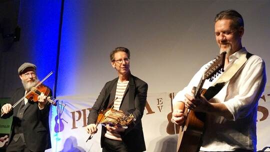 Pforzheim. Statt einer Geige setzen sie eine fünfsaitige Bratsche ein. Deren dunklerer Klang passe besser zu seiner Schlüsselharfe (Schwedisch: „Nyckelharpa“), sagt Olov Johansson. Den Beweis liefert die international erfolgreiche schwedische Folkband Väsen (zu Deutsch: „Wesen“) beim ausverkauften Prisma-Konzert im Pforzheimer Gasometer.