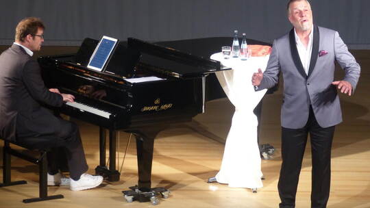 Er begann behutsam, das Publikum über leise und ruhige Töne in seine Welt der Musik zu entführen, tastete sich langsam und spannungsvoll vor. Schnell gab er seinen Melodien dann aber einen aufregend weiten Raum. Ließ seine Zuhörer Abenteuer erleben zwischen Pop, Chanson, Operette und Jazz.