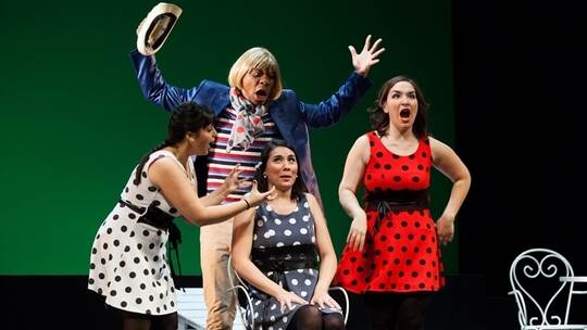 Dem sangesfrohen Quartett, das bei der Aufführung durch ein Klavier begleitet wird, bietet sich hier bei geringem Aufwand reichliche Gelegenheit zur Entfaltung ihrer vokalen und komödiantischen Talente. Die Einstudierung durch Jochen Schönleber hält sich weitgehend an die Fassung, die 2015 gezeigt und zwischendurch auch an der Accademia del Maggio Musicale in Florenz gespielt wurde. Dabei fällt der treuherzigen Regie nur wenig ein, um den munteren Arienabend szenisch zu beleben; vielmehr sind die unvorteilhaften Kostüme der Sängerinnen geeignet, den musikalischen Spaß optisch ein wenig zu trüben.