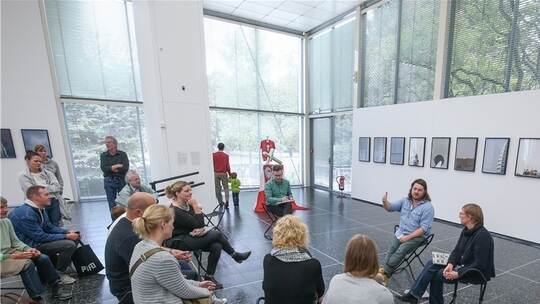 Schönfelder und Czech haben beim Künstlergespräch auch den druckfrischen Katalog zur Ausstellung vorgestellt. Die Förderung der Werner-Wild-Stiftung Pforzheim ermöglichte die Publikation. Sie umfasst 96 Seiten mit zahlreichen Abbildungen und mehreren Texten: Schönfelder analysiert die Ausstellung. Ana Kugli, zweite Vorsitzende des Kunstvereins, stellt spannende Bezüge zu Bertolt Brecht her, und Deyan Sudijc, Direktor des Design Museums in London, setzt sich mit der Macht und zerstörerischen Kraft von Architektur auseinander.