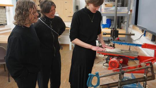 Pforzheim. Die mattgrün lackierte Strickmaschine mag zwar schon etwas älter sein, doch sie funktioniert noch tadellos. In den kommenden Wochen und Monaten will Minerva Skyttä intensiv mit ihr arbeiten, um traditionelle Techniken auf eine neue Ebene zu heben. Nicht nur sie geht neue, innovative Wege, sondern auch Hanni-Katri Eskelinen und Floor Berkhout.