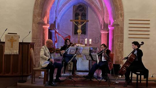 Schömberg/Langenbrand. Auf Einladung des Bratschisten Martin Hahn war das Heidelberger Domin-Quartett am Samstagabend nach Langenbrand gekommen, um dem Publikum meisterhafte Werke der Kammermusik zu präsentieren. In der gut besuchten Ulrichskirche konnte man einen Konzertabend erleben, an den man noch lange denken wird. Als Pforzheimer Konzertmusiker kennt Hahn die Befindlichkeiten vieler Zuhörerinnen und Zuhörer und hatte daher die Auswahl und Reihenfolge der drei gespielten Musikstücke ganz bewusst gewählt: Mit dem ersten Werk, dem „Quartettsatz“ des Zeitgenossen Mario Venzago, wurde der Abend gleich mit dem musikalischen Höhepunkt eröffnet.