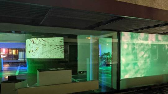 Pforzheim. In Grüntöne getaucht ist das Umfeld der grauen Betonblöcke zwischen Schloßberg und Fußgängerzone, vom LAF-Projektraum bis zum ehemaligen Restaurant „Aratat“. Noch bis Anfang Mai sind die Fenster und Vitrinen jeden Abend nach Einbruch der Dunkelheit hell erleuchtet. Gezeigt werden Lichtskulpturen der Hochschule Pforzheim und Videoarbeiten vieler Künstler. Es treffen Positionen aufeinander, die die Beziehung zwischen Natur, Technologie und Mensch beleuchten.