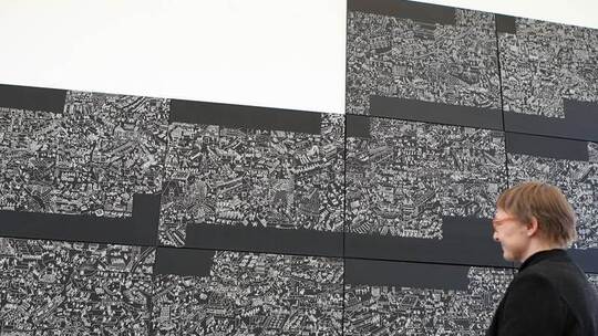 Der Kontrast aus Nah und Fern prägt auch ein anderes Werk der Ausstellung. Die südkoreanische Künstlerin Ah Hee Lee hat sich in „Dream Records“ mit ihren Träumen befasst – und mit ihnen eine besondere Art von Tagebuch erstellt. Zehn schwarze Platten hängen da an der Wand. Jede Einzelne steht für einen Monat, ist noch mal unterteilt in kleine Quadrate: Das sind die Tage. An jedem Morgen hat Lee ihre Träume in Bilder überführt, von nahem sieht man kleine Figuren, die mit weißer Farbe auf die schwarze Leinwand getüpfelt sind – doch von weitem verschwimmen die Punkte zu einer komplexen Wimmellandschaft. Auch die anderen Werke der Schau – von Mark Formanek, Martin Bruno Schmid, Nathalia und Alexander Suvorov-Franz und Isabel Zuber – sind aus der Wiederholung geboren – und zeigen, wie viel Zeit in ihnen steckt.