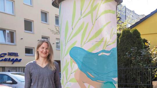 Tina Gruschwitz ist in der Nordstadt aktiv. „Das großflächige Format, der Standort und die Rundung stellen eine Herausforderung dar“, sagt sie. Schön seien die Reaktionen einiger Passanten, die sich sichtlich freuten. In ihrer Arbeit verbindet sie fließende Linien mit organischen Formen, inspiriert von Wasser in seinen verschiedenen Zuständen: flüssig, gasförmig und kristallin.