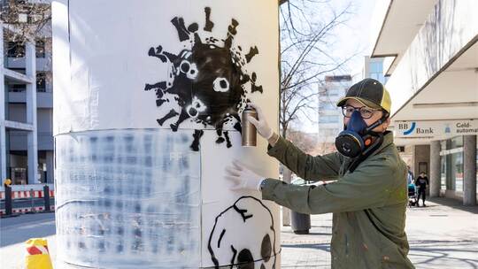 Uli Ganter entwickelt seine Motive oft beim Malen. In diesem Falle: drei Reiterfiguren. Die Spinnenbeine der Pferde greifen die Schlankheit der Säule auf. Dem „kosmischen Zugriff“ widmet sich Eckhard Bausch. „Um so etwas Ähnliches handelt es sich ja in der Coronakrise. Vielleicht ist es wirklich eine Reaktion auf die ungebremste Ausbeutung unseres Planeten“, sagt er. Alfred Müller sprüht Graffiti-Totenköpfe und -Coronaviren. Sein Motto: Corona sucks (nervt). „Ich denke, bald werden die meisten die Nase voll haben davon, zu Hause zu sitzen“, sagt Müller, dem die Isolation zu schaffen macht.