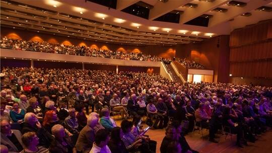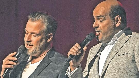 Fast zwei Stunden lang feiern die beiden klassisch ausgebildeten Sänger am Samstagabend im voll besetzten großen Saal ihren 20. Geburtstag als Duo und versprechen ihren Zuhörern: Auch im kommenden Jahr werden sie gemeinsam auf der Bühne stehen. „Dann sind wir auch nach der alten Regel volljährig.“ Im Gepäck haben die beiden ein „reines Zugabenprogramm“, bestehend aus Stücken, die sie stimmlich und emotional besonders gefordert haben. Da darf natürlich „If You Could See Me Now“ nicht fehlen: Jene langsame, gefühlvolle Ballade, die die beiden vor 20 Jahren in einem Tonstudio zusammengebracht hat. Sie bleibt an diesem Abend nicht die einzige: Ein Lied nach dem anderen singen Marshall und Alexander in Richtung Publikum – begleitet von „der weltbesten Ein-Mann-Kapelle“, nämlich von René Krömer am Klavier. Er streicht mal ganz sanft über die Tasten und langt mal kräftig hinein, während die beiden auf Deutsch, auf Englisch und vor allem auf Italienisch singen.