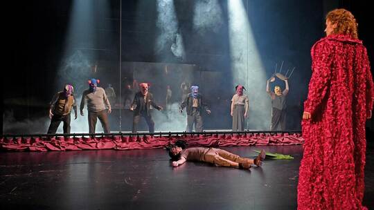 Dagegen zeigt die Katharina-Darstellerin ihr Gesicht stets offen. Sie steht in ihrem blutroten Abendmantel allein vor dem herunter gelassenen Theatervorhang an