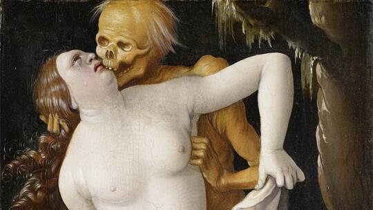 In einer hoch gebildeten, überwiegend in Straßburg und Freiburg beheimateten Familie aufgewachsen, gelingt es dem Zeitgenossen Reuchlins, „tradierte Bildthemen neu zu interpretieren und religiöse Themen in der Lebenswelt seiner Zeit zu verankern“, schildert Baumbusch. In dieser Umbruchzeit zwischen Mittelalter und Neuzeit, zwischen Reformation und Bauernkrieg stehen auch die Themen der Vergänglichkeit, Vanitas-Motive, im Vordergrund. Und hier entwickelt der Künstler höchst eindringliche Werke, die einen Dialog mit dem Betrachter eingehen, ihn in die Rolle eines Voyeurs versetzen. Da ist der Blick auf „die unverhüllte, weibliche Scham“ im Gemälde „Der Tod und die Frau“ (um 1520), „der die Frage aufwirft: Wie groß ist der eigene Anteil an der Sünde, wie sehr ist man selbst Adressat dieses erotischen Spiels?“