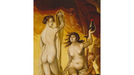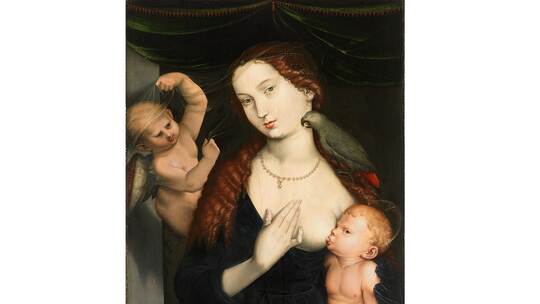 Hans Baldung macht auch vor zutiefst religiösen Themen nicht Halt, wie in seiner „Maria Maria mit Kind und Papageien“. „Ist das noch ein Andachtsbild oder eher ein Werk, das sich der Auftrageber in die private Kunstkammer hängte?“ fragt Baumbusch. Der deutlich dem Säuglingsalter entwachsene Jesusknabe schaut den Betrachter direkt an, während ihm die Brustwarze der Mutter bereits aus dem Mund rutscht. Dazu ein Papagei, der Maria am Hals knabbert, ein Putto, der mehr ein Amor ist und eine Perlenkette auf makellos schöner Haut – da schwingen deutlich Venus-Darstellungen mit.