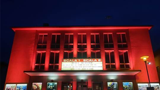 Sie leuchteten wieder: Bei der bundesweiten Protestaktion „Night of Light“ hat die Veranstaltungsbranche auf ihre Forderungen aufmerksam gemacht – Wiederbeginn der Kultur, Unterstützung bis 2022, Starthilfe für Firmen sowie Insolvenzschutz. Unter dem Hashtag #alarmstuferot erleuchteten am Dienstagabend Theater, Clubs, Denkmäler und Wahrzeichen. Neben dem Kulturhaus Osterfeld auch das Kino Scala in Mühlacker.