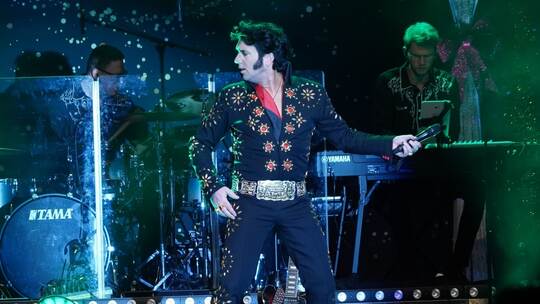 Die schwarze Haartolle, die langen, breiten Koteletten, die glitzernden Anzüge: alles genauso wie beim Original. Nur das üppige Brusthaar fehlt. Dafür hat