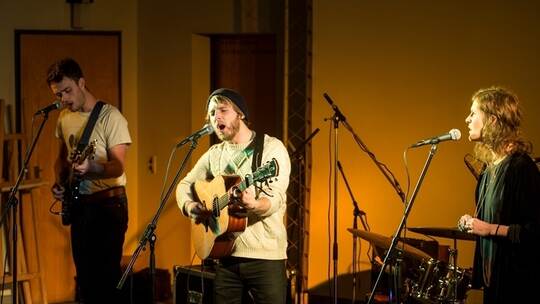 Mit berührendem Folk-Pop knüpfen We Were Strangers nach der Pause an. Der Songschreiber Stefan Melbourne war beim zweiten „Horch!“-Konzert solo zu Gast, nun tritt er als Trio auf: mit weiterer Gitarre und Gesang, im Gepäck das Album „Beneath A Broken Sky“. Auch seine ausdrucksstarke, leicht raue Stimme weckt reichlich Assoziationen: Ben Howard oder David Gray ist da zu hören. Und wenn Chloe Leavers einsteigt, entfacht das den unwiderstehlichen Zauber wie einst Lisa Hannigan an der Seite von Damien Rice.