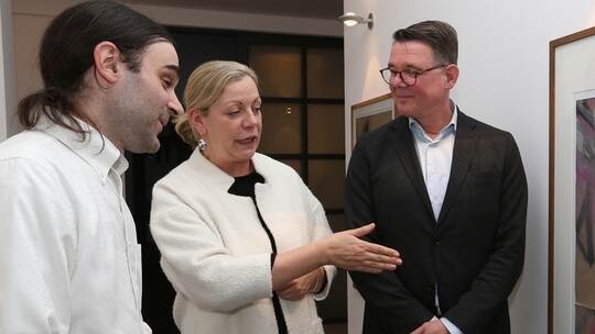 Diese Verfremdungen münden in Werke wie „gondii machine II“, wo unter der scheinbar transparenten Oberfläche nach 15 bis 20 Übermalungen die ursprünglichen Linienfragmente zart durchscheinen. Doch auch kräftig farbige, gesprühte Tags komponiert der 37-Jährige zu intensiven Bildern. Rund 30 Arbeiten, die zum Teil den Schritt in die dritte Dimension wagen, sind zu sehen – und erzählen vieles über eine künstlerische Welt, „die unsere heutige Zeit kongenial repräsentiert“.