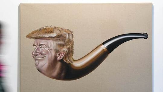 Das hängt vom ganz persönlichen Geschmack ab. Spektakulär beispielsweise die rote Arcylskulptur des ukrainischen Künstlers Aljoscha bei der Galerie Martina Kaiser, die sich schwebend leicht in die Höhe schraubt und dabei das Licht einfängt. Ganz leise und doch eindrucksvoll die Landschaftsbilder aus dem Tessin und Basel von Hermann Hesse beim Kunsthandel Thole Rothermund. Und auch der US-Präsident Donald Trump darf nicht fehlen: Er grinst auf einem Gemälde des deutschen Künstlers Holger Kurt Jäger als Pfeifenkopf selbstgefällig zur Seite – ironische Referenz an das Pfeifenbild von René Magritte. Statt „Ceci n’est pas une pipe„ ist nun zu lesen: „Ceci n’est pas un meme“ (Das hier ist kein Scherz). Wen kann man treffen?