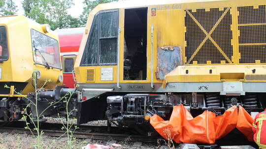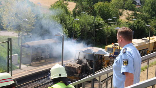 Das vordere Abteil des Bauzuges sowie die Oberleitung sind von dem Brand betroffen. Die Personen im Zug konnten sich selbst retten und wurden vom Roten Kreuz betreut.