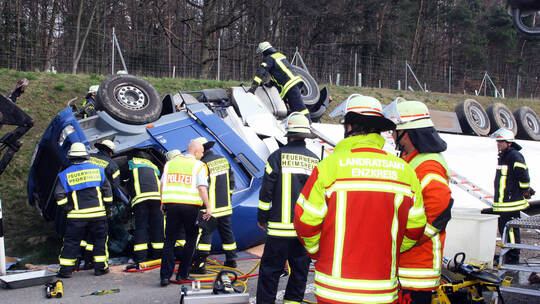 {element}Zeugen hatten ausgesagt, dass der Fahrer bereits im Baustellenbereich bei Friolzheim mit seinem Lastwagen Betonleitplanken gestreift hatte. Es entstand ein Schaden von rund 200 000 Euro. Da Acryllack-Grundstoff ausgelaufen war, wurde das Umweltamt verständigt. Ein Flurschaden von rund 1500 Euro entstand zusätzlich. Die Berufsfeuerwehr Pforzheim war mit acht Fahrzeugen, die Freiwillige Feuerwehr Heimsheim mit vier Fahrzeugen sowie das DRK mit zwei Fahrzeugen und dem Notarzt im Einsatz.