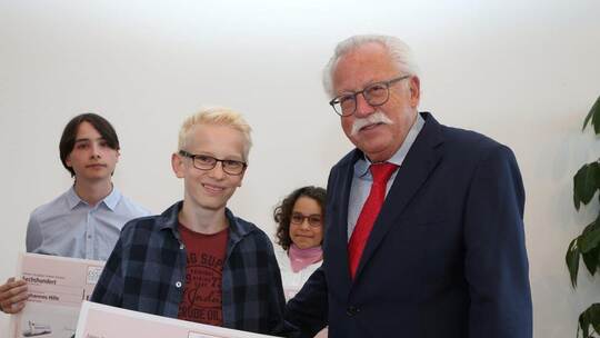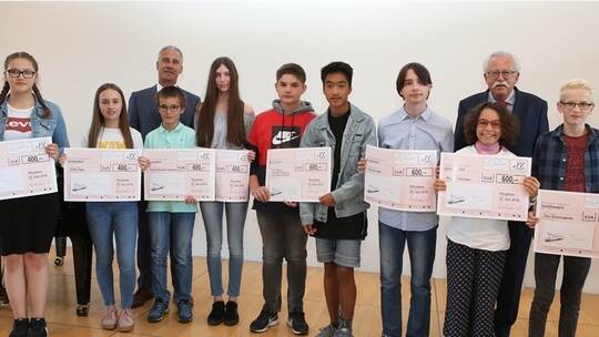 Beim Video-Wettbewerb seien nur wenige, aber sehr pfiffige Beiträge eingegangen. Die Klasse 6c des Hilda-Gymnasiums sowie die Klasse 9a des Gymnasiums Neuenbürg nahmen dafür einen Scheck der BW-Bank in Höhe von 250 Euro im Empfang. Klangvoll umrahmt wurde die Preisverleihung vom „Konzertissimo“ Kinder- und Jugendchor der Chor-Akademie Pforzheim unter der Leitung von Salomé Tendies.