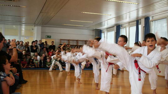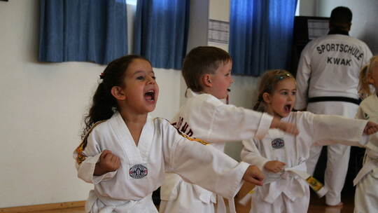 Wilde Kampfschreie, begeistertes Johlen und rhythmische Musik – ein Spaziergänger dürfte sich an diesem Sonntagnachmittag über die ungewöhnliche Geräuschkulisse gewundert haben, wenn er an der Merianstraße am Meßplatz entlang flanierte. Denn im Haus Nummer 6 hatte die Sportschule Kwak zum Tag der Offenen Tür eingeladen.