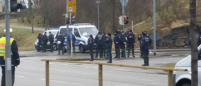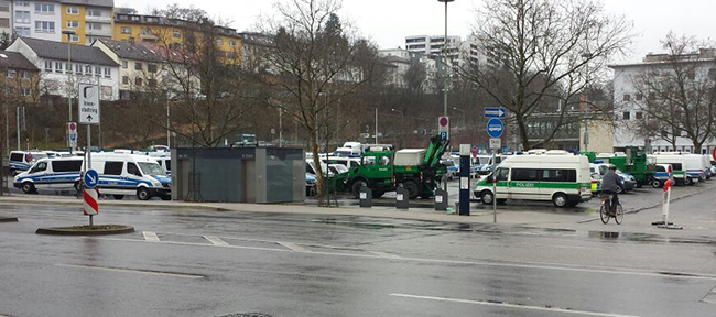 15.10 Uhr: Immer mehr Mannschaftswagen der Polizei treffen langsam auf dem Wartberg ein. Ein Anti-Konfliktteam ist ebenfalls anwesend sowie Erster Bürgermeister Roger Heidt und Wolfgang Raff, Leiter des Ordnungsamtes. Von Demonstranten bislang noch keine Spur.