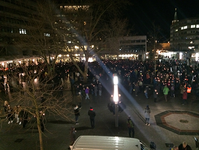 20:05 Uhr: Auf dem Marktplatz haben sich rund 2000 Menschen versammelt, um mit einem Lichtermeer aus Kerzen friedlich den Opfern der Bombardierung zu gedenken. Während der emotionalen Gedenkfeier läuten die Glocken in der Innenstadt.