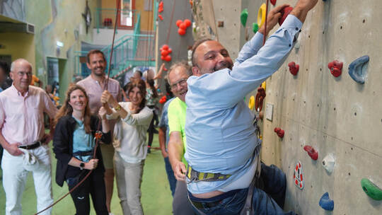 Pforzheim. Es dauert nicht lang, bis Mohamed Zakzak das Klettergeschirr angelegt hat. Ehrenamtliche des Alpenvereins (DAV) helfen dem städtischen Inklusionsbeauftragten aus seinem Rollstuhl an die Kletterwand und zeigen ihm, welche Griffe er am besten benutzt. Nach wenigen Minuten hängt er dort aus eigener Kraft: zum ersten Mal in seinem Leben. „Man hat das Gefühl, zu fliegen“, sagt Zakzak, dem sein kurzer Kletterversuch zwar „ganz schön in die Arme“ geht, aber auch „richtig Bock“ macht. Mit dieser Erfahrung ist der Inklusionsbeauftragte am Sonntag nicht allein: Zahlreiche Menschen mit Behinderung kommen in das Sektionszentrum des Alpenvereins auf der Wilferdinger Höhe, um dort das Klettern auszuprobieren. Auf die Beine gestellt hat der Verein die Aktion in Kooperation mit Zakzak und seiner Kollegin Anne Marie Rouvière-Petruzzi, der Inklusionsbeauftragen des Enzkreises.