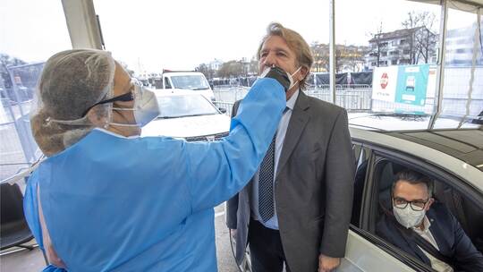 Pforzheim: Am Montag ist der Startschuss am Corona-Testzentrum am Messplatz gefallen. Bereits um 6 Uhr öffneten die Pforten und die ersten Personen konnten sich vom fachkundigen Personal testen lassen. Um 8.30 Uhr stellte sich Oberbürgermeister Peter Boch als Proband zur Verfügung.