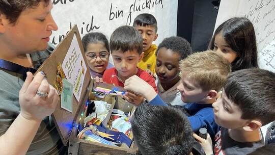 Mit Taschenlampen ausgerüstet, gingen die Kinder auf Drachensuche. Mit Elementen aus dem Stück „Kuno kann alles“ von Henry Mason, das derzeit im Spielplan läuft, gab es Stationen in der Malerei – „So große Pinsel habe ich noch nie gesehen“, staunte ein Kind –, Schreinerei, Requisite und im Fundus. Nach einem veganen Drachenessen entdeckten die Kinder mit kleinen Rätseln spielerisch die versteckten Sachen im Theater. Im Podium führten die Puzzleteile zum heiß ersehnten Drachenschatz. Was hat den Kindern am besten gefallen? „Der Keller“, sagte Vanessa, „da war es schön gruselig.“ „Alles hat Spaß gemacht“, fand Rebin. „Die Kleider, die Bühne, der Drache“, stimmten die anderen Kinder ein. Das Interesse für kulturelle Bildung und die Lust an kulturellen Angeboten beginnen bereits im frühen Kindesalter. Das zeigt der Kinder-Kunst-Tag Baden-Württemberg der element-i Bildungsstiftung jedes Jahr im Mai. Wer die Sonderführung im Theater mit seinen Kindern selbst erleben möchte, dem sei der Familien-Theatertag am 17. September empfohlen. pm