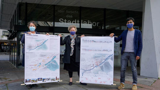 Zu Beginn dieser Phase sind auch die Bürgerinnen und Bürger und die Öffentlichkeit eingeladen, sich zu beteiligen. Dazu stellt das städtische Planungsamt nicht nur den Siegerentwurf, sondern alle fünf Entwürfe im Stadtlabor im Erdgeschoss des Rathauspavillons am Marktplatz aus. Gemeinsam mit Jurymitglied Professorin Uta Stock-Gruber hat Bürgermeisterin Sibylle Schüssler die Ausstellung im Stadtlabor eröffnet.