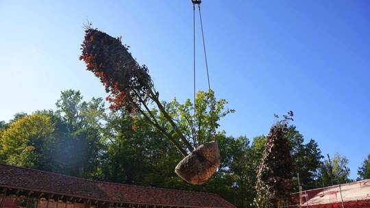 Die rund sieben bis acht Meter hohen und drei bis vier Meter breiten Bäume wurden mit Unterstützung eines 75-Tonnen-Krans der Firma Rothmund in vorbereitete Baumgruben mit den Maßen 4 x 4 x 1,5 Meter gesetzt.