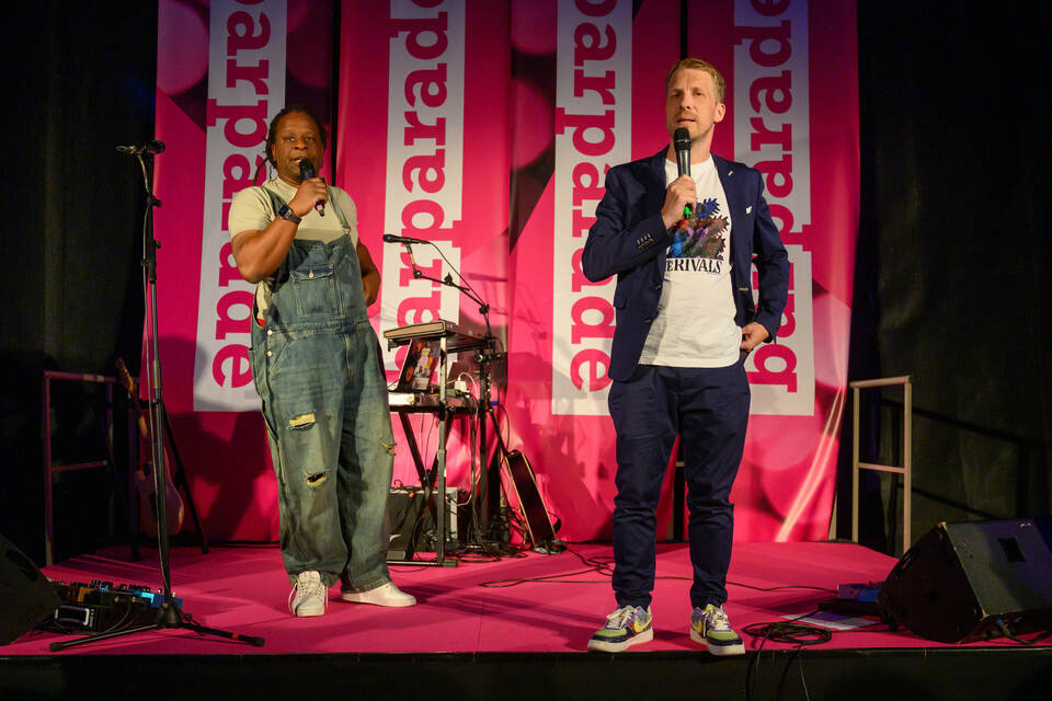 Nach dem letzten Lied von Batomae standen schon die Stargäste des Abends, Mola Adebisi und Oliver Pocher, am Anfang des pinken Teppichs, um durch die Menschenmenge zur Bühne zu schreiten. Dort angekommen, sorgten sie mit ihrem Humor gleich für einige Lacher.