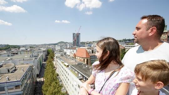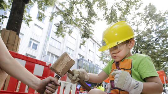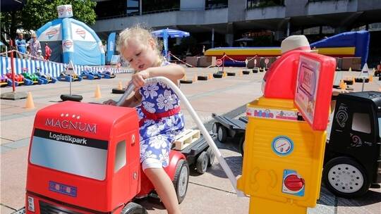 Einen fast schon magischen Reiz üben Baustellen auf so manchen kleinen Jungen aus. Und so wähnte sich der ein oder andere am Samstag beim großen Baustellen-Sommerfest in der Fußgängerzone wohl im Paradies. In einem riesigen Sandkasten der Mobilen Kinderarbeit des Stadtjugendrings standen nicht nur Schaufeln und Eimer, sondern auch Bagger parat, im Logistikpark auf dem Marktplatz konnten die Kleinen mit Lastwagen und Gabelstaplern ihre Geschicklichkeit unter Beweis stellen und einige Schritte weiter ging es mit einem Steiger in 46 Meter Höhe – atemberaubender Blick über die Stadt inklusive.