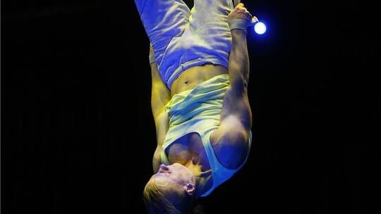 Darauf hat Viktar Shaniova aus der Ukraine nur gewartet. „Er ist ein begnadeter Artist und ein absolutes Show-Talent – wie gemacht für den Zirkus“, sagt Larissa. Die Strapaten um die Handgelenke oder den Oberarm gewickelt, lässt er sich von einem Kollegen in die Höhe ziehen.